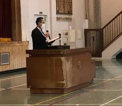 演奏前に,校長から「金管バンドのみなさんが,全国大会に出場したこと,そして,さいたまスーパーアリーナでどんなすばらしい演奏をしてきたかを知ってもらい,全国大会出場のレベルがどんなものか,教室での動画視聴ではなく,富ヶ丘小学校のみなさんにじかにライブで見て感じてもらいたかった。」と披露式を行った理由を説明しました。