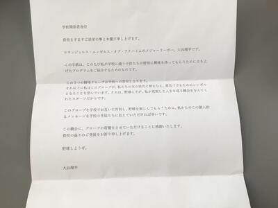 大谷翔平選手から,メッセージととも3つの野球グローブが届きました。